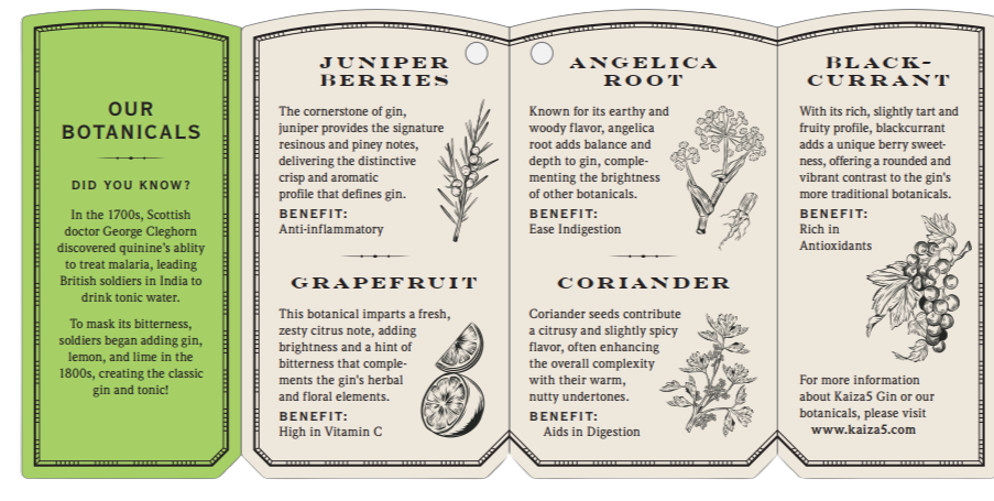 Kaiza 5 Gin is expertly crafted with five signature botanicals: juniper berries, angelica root, blackcurrant, coriander, and grapefruit. Each ingredient is chosen not just for flavour, but for its natural benefits—delivering a smooth, bold gin with depth, balance, and a crisp finish that’s as good for the palate as it is for the soul.